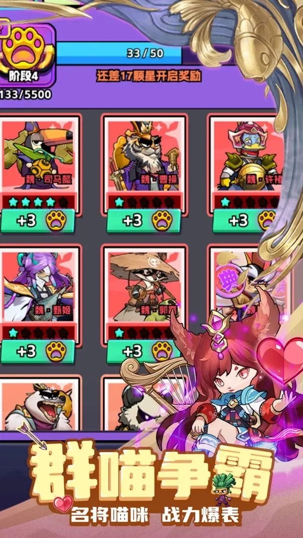 4、拥有丰富的武将卡牌,可以收集和培养各种猫武将,每个武将都有独特的技能和属性。