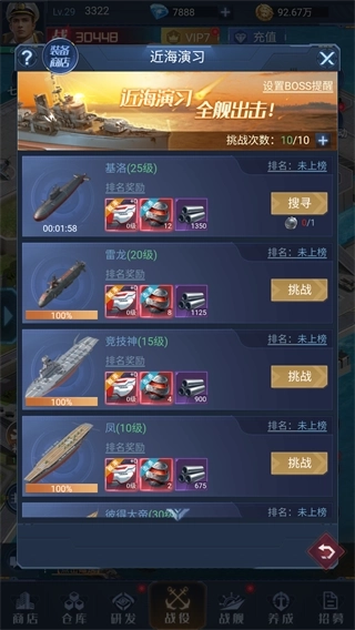 10级解锁,随等级开放更多的战舰挑战,挑战任意战舰可立即获得一份固定奖励,初始挑战次数为10次,随时间进行恢复次数,战舰被击败后,参与挑战的玩家根据累计伤害进行排名,奖励邮件发放,最后击杀战舰的玩家会额外获得一份击杀奖励,同时会概率触发幸运奖励,击杀BOSS着则会高概率触发。该玩法可获得金装精华、碳化钢、极品装备等,也可以在装备商店使用金装精华碳化钢等材料进行兑换装备。