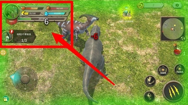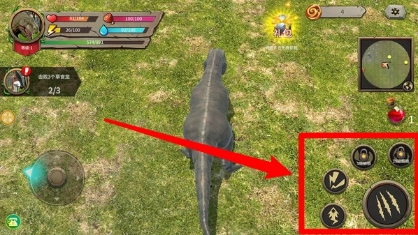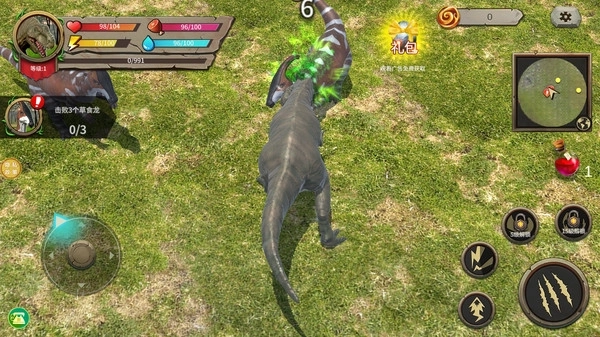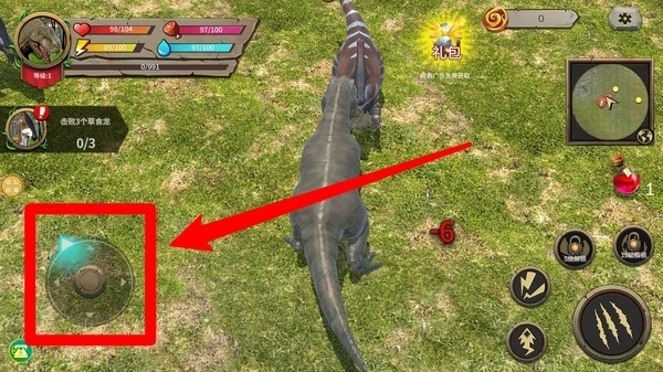1.左侧虚拟摇杆:通过拖动屏幕左下角的虚拟摇杆控制暴龙移动,自由探索草地与猎物位置。