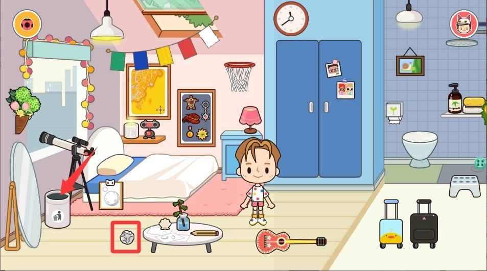 4、发现地面遗留垃圾时点击拾取功能,随后将其移动至垃圾桶图标处完成环境卫生维护。