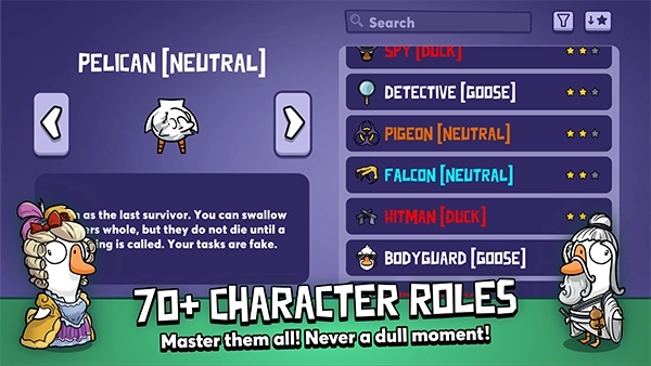 在这场游戏里,猎鹰有着特殊的胜利规则:要是它成为最后的幸存者,就能直接赢得比赛;当场上仅剩三名玩家时,会启动一个计时器,只要猎鹰能坚持到计时结束,同样可以获得胜利。而鹅和鸭子的获胜方式不同,鹅需要完成各项任务来达成胜利条件,鸭子则是通过实施破坏行为来取得胜利。