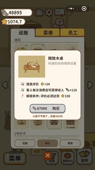 4、建议能买的菜品尽量购买,因为部分动物需要等玩家解锁对应的菜品后才会出现。解锁菜品就等同于解锁新动物,这样还能完成相关成就。