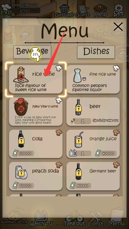 3、点击菜单管理按钮进入食谱界面,研究并解锁不同种类的饮品与小吃配方。