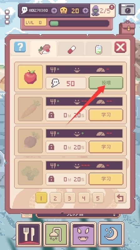 4、最后点击食物图标完成喂食,看着宠物享用美味,能提升彼此的亲密度。