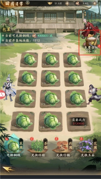 当等级达到22级时,就能解锁第三个资源获取场景——田园日常。田园是每日必做的常规任务,也是获取资源最便捷的方式:依靠战斗力解锁菜园的种植坑位,以此提高资源获取的上限。开垦荒地后,每天点击对应的苗圃就能收获相应资源,还可以额外消耗元宝来增加收获次数。