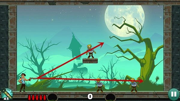 操作起来比较轻松,底部的僵尸可以直接直线射击解决,上方的敌人则需要利用墙面反射来命中。要是对角度的把握不太熟练,多尝试几次就能找到最理想的解决办法。