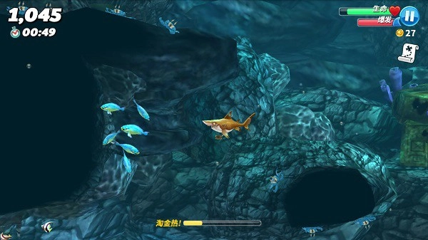 各种各样的任务等你完成,可以升级的鲨鱼属性,装上各种装备,使用道具。