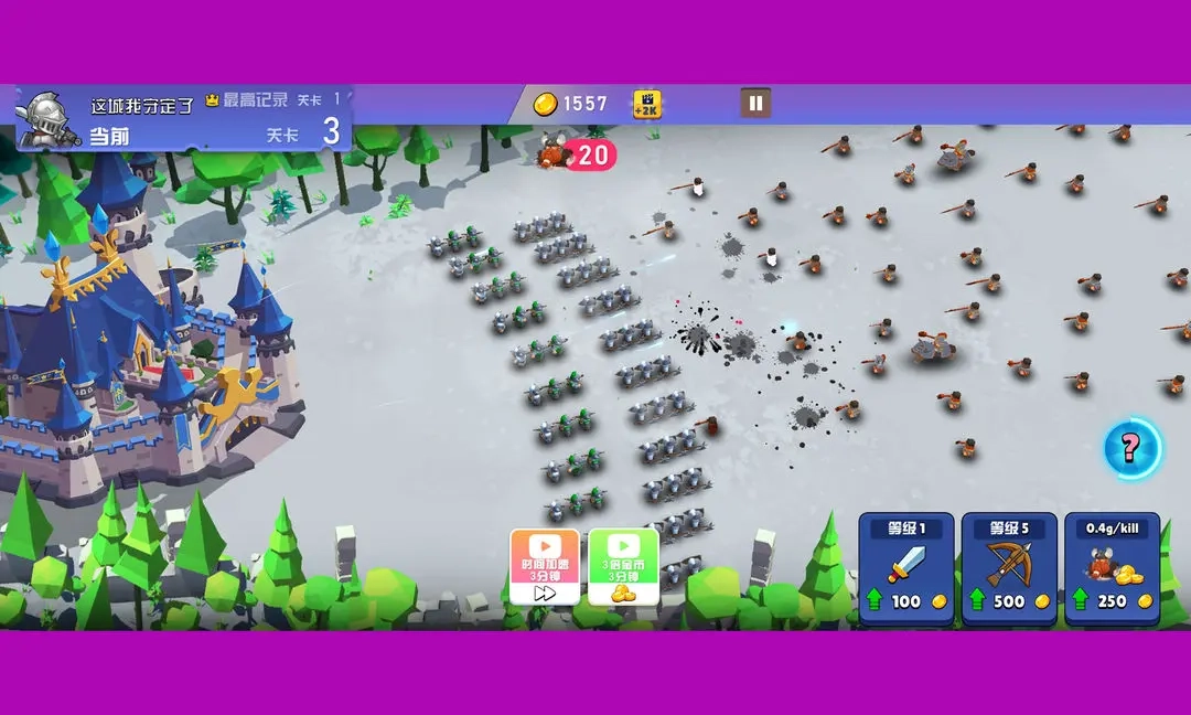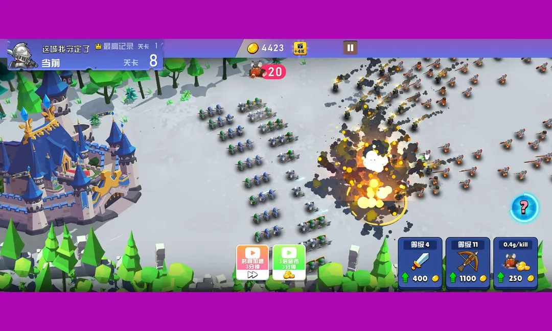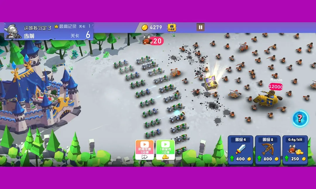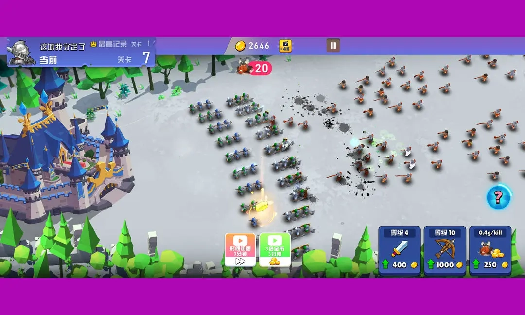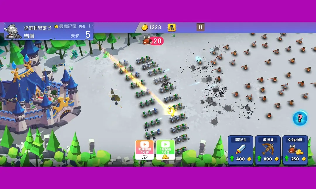 在游戏里,敌人会从屏幕右侧朝着城堡发动进攻,玩家需要指挥士兵展开防御。