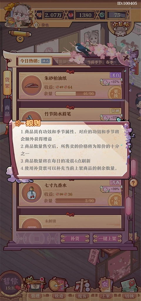 玩家需要收集原料与材料,用来制作胭脂及其他物品,与此同时,还得建设属于自己的店铺,像房屋、庭院、仓库这类设施都要搭建起来。