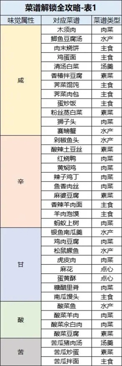 每一道菜都具备自身的味觉属性,像酸甜苦辣这类,在研究菜谱的过程中,能够依据菜名下方标注的味觉属性去挑选其中涵盖的部分固定食材,例如辛对应的是辣椒、甘对应的是糖。另外,当有NPC上山时,要是你邀请他们一起吃晚餐,他们会表明自己的味觉喜好,你得满足他们的需求才能得到奖励。关于菜谱类型,由于NPC或许还会对主食、点心等有偏好,要留意把它和味觉属性区分开,比如南瓜馒头虽然属于甜食,但它是主食而非点心。下面是我整理好的所有菜谱属性。