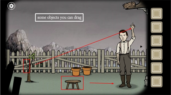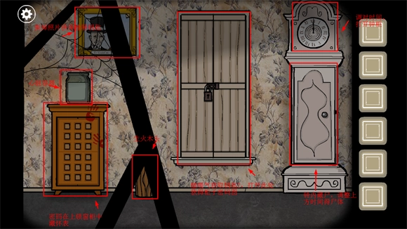 把场景向右拉动,点击那位绅士,就能得到“我想生火”的情报。接着点击右下角的柜子,在第二个抽屉里找到生火用的火柴,再利用照片框架获取钥匙1,用它打开下方带锁的抽屉,就能拿到斧头——斧头的用途是劈柴。