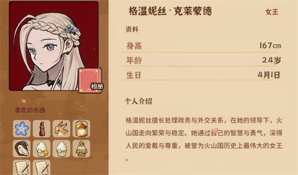 格温妮丝喜爱的物品包括勿忘我、火山女神木雕、兔子、金盏灯、白鸟护符、雪花沙冰、百合香水,以及《帝国研究历史》的上册和下册。