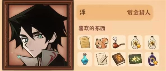 泽喜爱的物品包括《魔物研究笔记》、棕色烟斗、松鼠、香醇马奶酒、吐真剂、《猎物定价规则》、《火山法典》、《白花》和热葡萄酒。