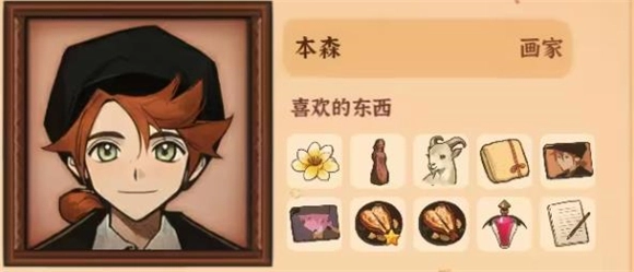 本森喜爱的物品包括金色兰花、火山女神木雕、带有香气的毛巾、山羊、本森肖像、烧烤龙虾肉、魔神药水以及《绘画主题表现》。