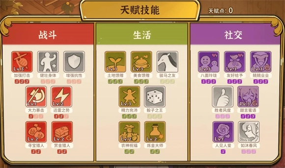 生活方面的天赋加点建议如下:首先,第一行推荐把种地和烹饪都点到3级。这两项天赋的加成效果,能让我们更高效地将食材加工成菜肴,从而获得更可观的行动力加成。其次,第二行的行动力天赋必须全部点满,相较于其他天赋,三点行动力加成能让我们在行动时拥有更高的自由度;尤其在游戏初期的几个回合里,额外的行动力有助于我们更快解锁新的天赋点。第三行建议优先点农神祝福,多出来的两格田地不仅能提供更多行动力,也是快速提升烹饪等级的关键环节。至于炼金天赋,在多数情况下实用性较低——夏火年阶段如果头脑属性没提升上来,前期两次炼金尝试很难成功;而等到能抓到马、可以制作马奶布丁后,头脑属性也不会太缺,所以炼金天赋可能只有前期点一下才有点用。