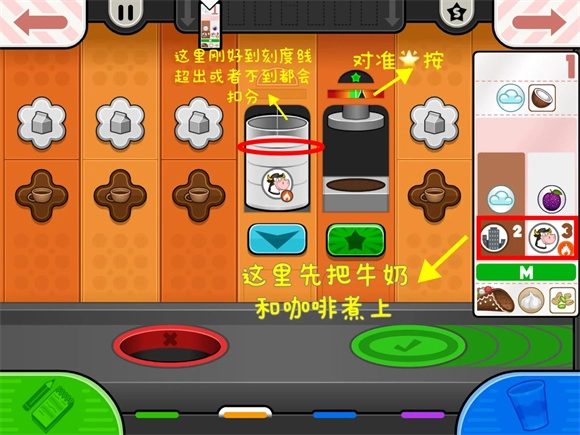 挤咖啡和牛奶时刻度线不能超出,超出会扣分