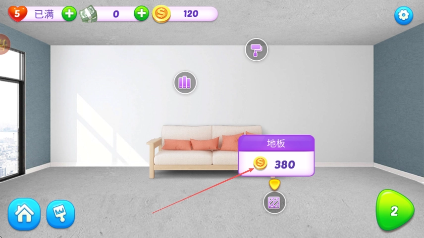 1、进入小家设计游戏后,查看界面上方,发现红心5已集满,此时钞票数量为0,接着点击墙壁图标,花费400金币购买墙壁装饰。