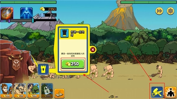 4、除了召唤士兵守卫基地外,还能借助右下角的建造功能,给基地增设防御塔之类的设施,增强防御能力。