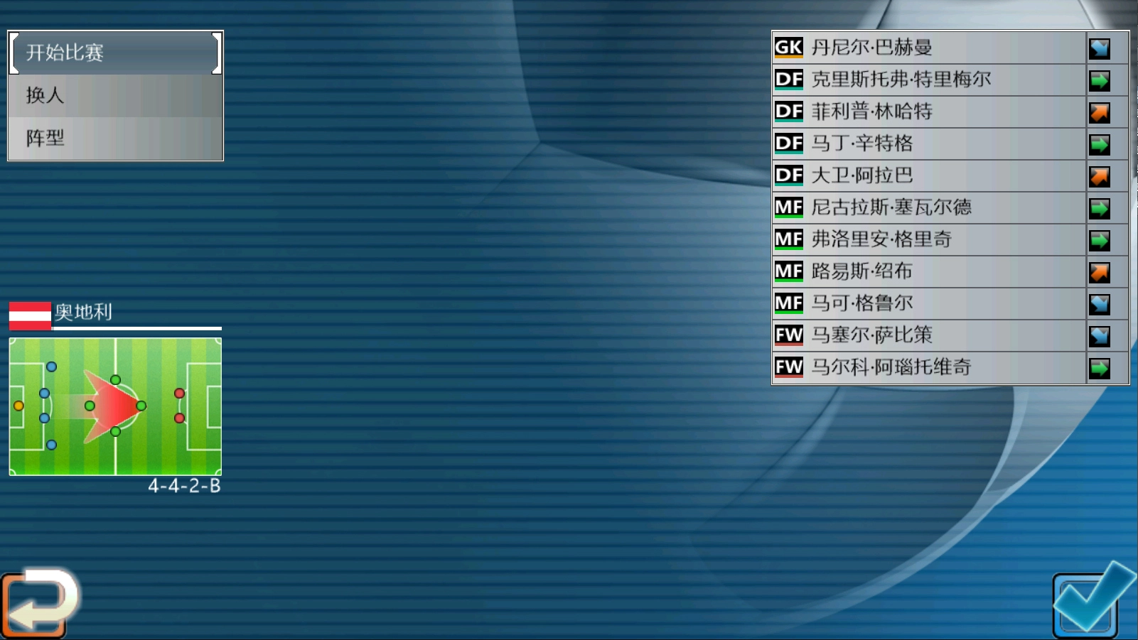 换人:调整首发阵容,每位球员都有能力值和详细数据(GK守门员、DF后卫、MF中场、FW前锋)。按照闪烁的方向键进行下拉和左右切换。
