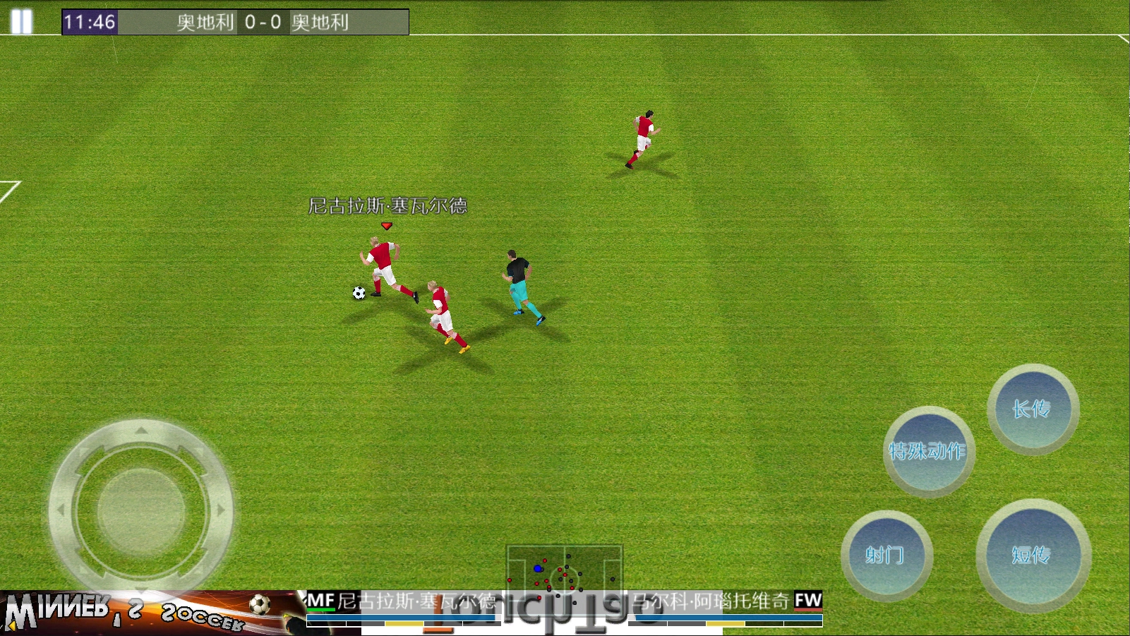 6、带有红色标记的人物是你自己的代表。巧妙运用各种技巧,顺利完成射门动作。
