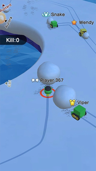 大的雪球能够通过吸纳小的雪球来让自己变得更大,不管这些小雪球是正在被人搓揉成型的,还是已经在场地里存在的。当你消灭到还剩最后一个对手时,可以先不立刻解决他,而是用你已经变得很大的雪球去不断吞噬他的雪球,让他陷入无法对你造成威胁的困境,以此来慢慢消耗他。