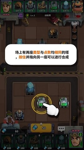 3、当场上存在两座类型和点数都相同的防御塔时,按住其中一座并拖动到另一座上,即可完成合成操作,具体效果可参照图示。