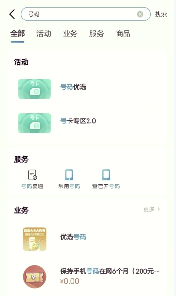 2、若想查看本人身份证名下的中国移动号码,步骤很简单,打开中国移动APP后,在首页搜索框输入『号码』,接着选择『查已开号码』选项,如此,你名下的手机号便会立刻显示出来。