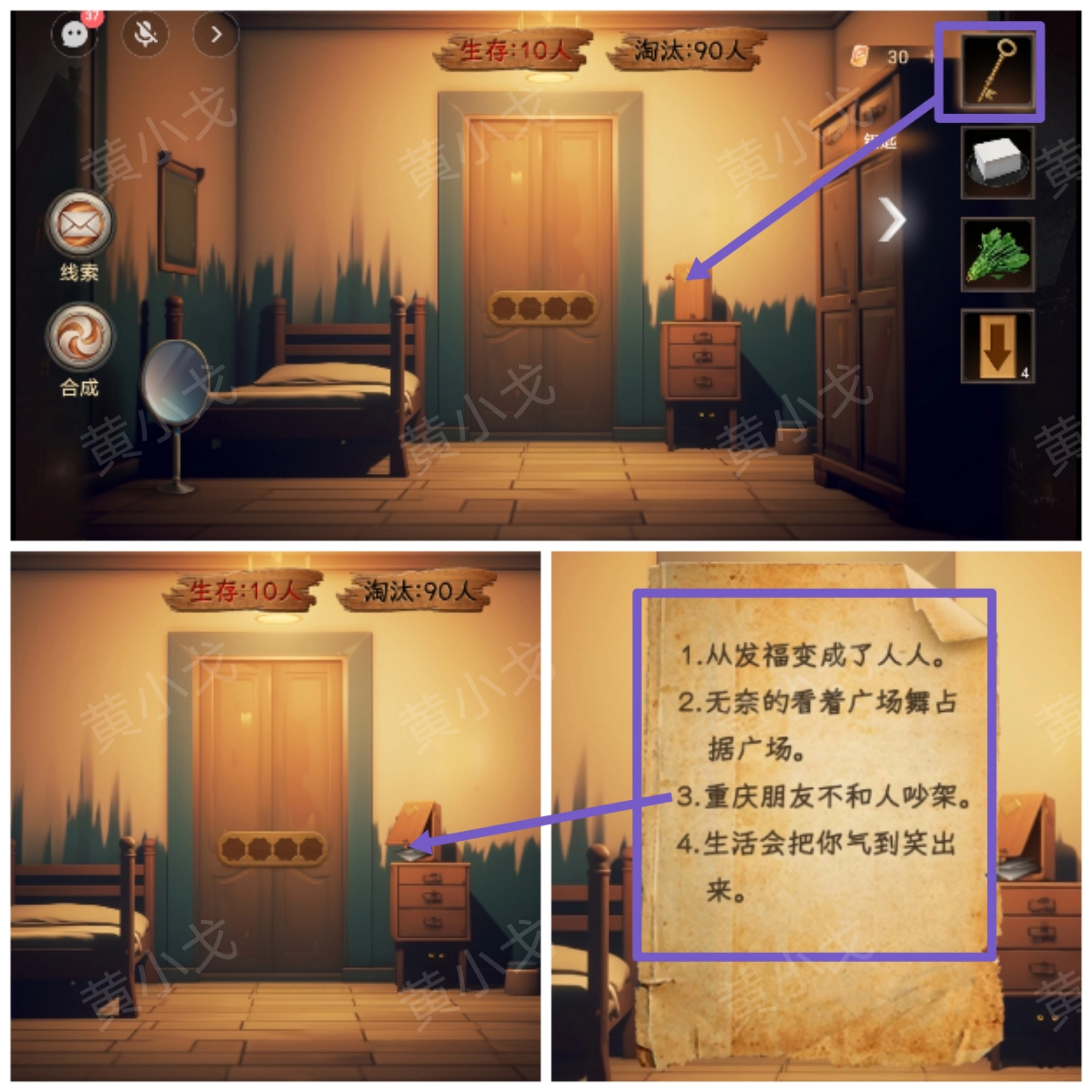 6. 拿【钥匙】把柜子打开,看看纸条上写了什么,然后告知男主。