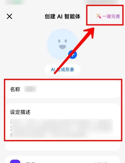进入创建AI智能体的页面,在输入名称、设定好描述后,点击页面右上角的【一键完善】按钮。