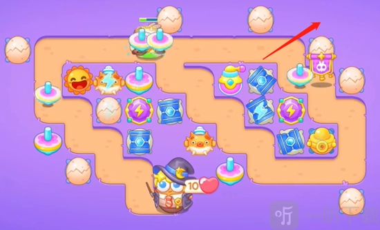 1在《保卫萝卜4》“阿波与魔法宝藏”的第46关开始时,我们首先在中间位置放上陀螺,接着在左边放置鸡蛋用于收割。当没有怪物需要打的时候,就把周围的小道具清理掉。
