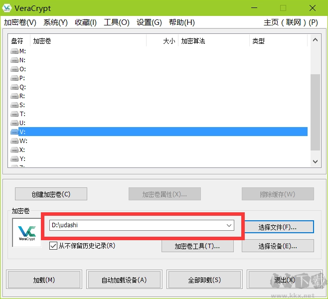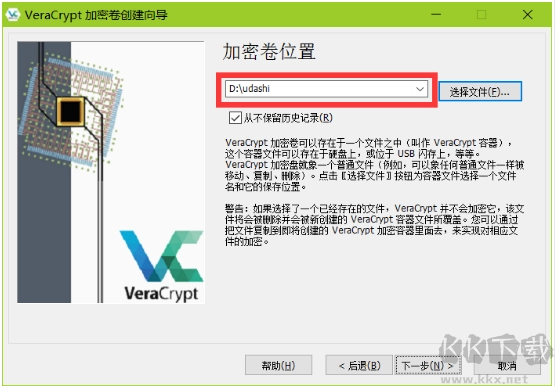 5. 挑选加密卷的存放位置,在此处查找盘符,接着创建文件,文件名可自行拟定。这里小编以在D盘创建为例,选择创建“udashi加密文件” 。