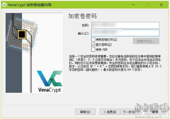 7.填写加密卷的密码(也可以使用密钥文件),然后点下一步;