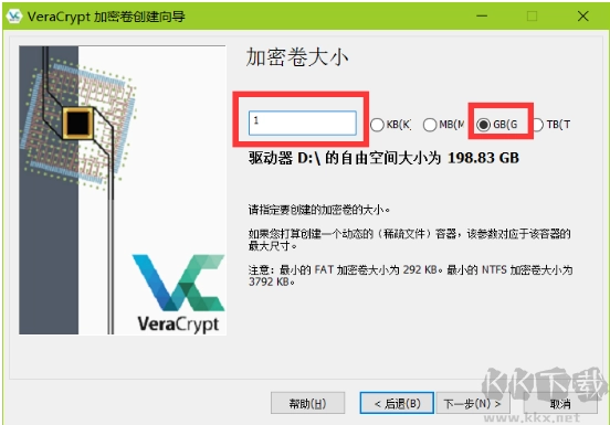 6. 接下来,一步步操作,到了选择空间大小这一步。通常,依据我们需要加密的物品数量来决定,按照实际情形选择即可。在此,小编选择1G。