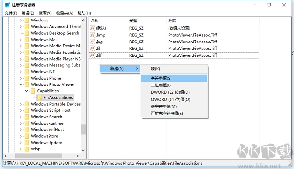 3、打开注册表编辑器之后,我们双击左侧的目录,依次打开 HKEY_LOCAL_MACHINE\SOFTWARE\Microsoft\Windows Photo Viewer\Capabilities\FileAssociations目录项,直到看到该子目录下的一系列关键文件。 4、FileAssociations目录下,我们对着该界面击右键,选择“新建-字符串值”菜单,如下图所示。