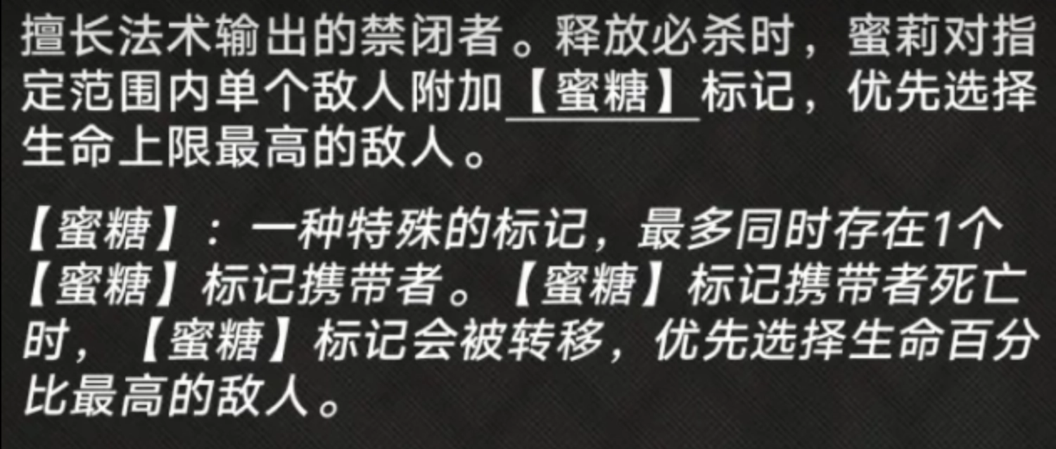 蜜莉在战斗中着重于法术输出,凭借此能力可瞬间扭转战局。她的技能搭配,不仅能对敌人造成惊人伤害,还能切实增强队友的输出能力。蜜莉拥有独特的被动技能“蜜糖”,当她释放必杀技时,会给敌人施加一种标记。此标记会优先附着在生命值最高的敌人身上,且同一时间最多只能标记一个目标。一旦被标记的敌人死亡,标记便会转移到生命比例最高的敌人身上。这一被动技能堪称大杀器,能持续掌控敌方血量与战场局势。