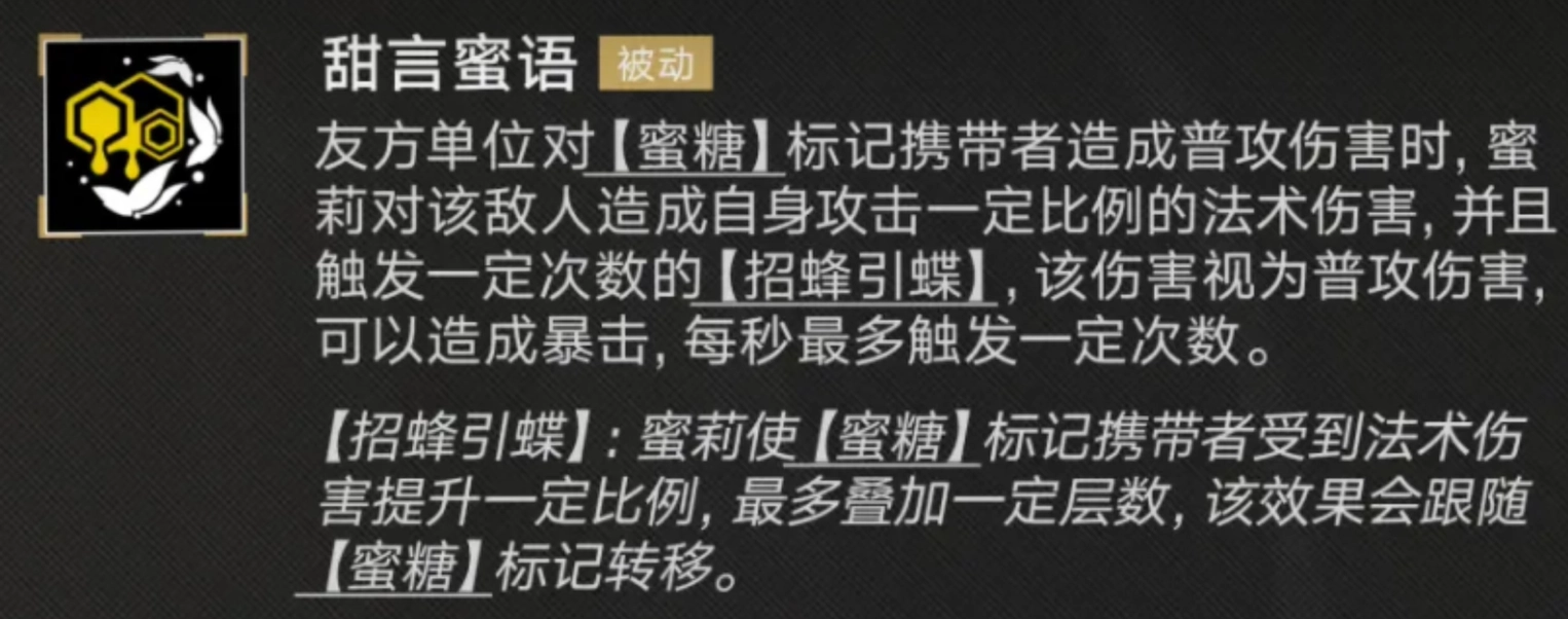 “甜言蜜语”堪称她又一项极具战术性的技能。每当队友对敌人发动普通攻击,蜜莉便会额外向敌人施加一波法术伤害,同时触发“招蜂引蝶”效果。在此效果下,敌人所受法术伤害会急剧提升,无疑是敌人的梦魇。而蜜莉的专属技能“解脱”,更是助力她在战斗中牢牢掌控主动权,可对全场敌人造成群体伤害,特别是对“蜜糖”携带者造成的伤害,着实令人惊叹。不仅如此,她还能触发“融化”效果,使敌人在特定时间内持续遭受法术伤害。
