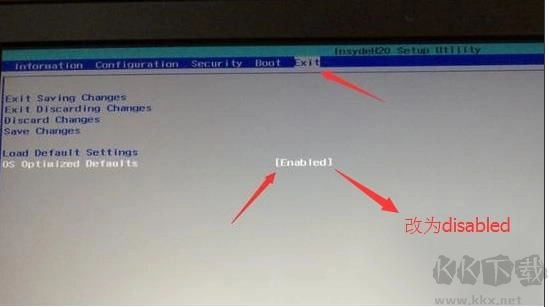 2、转到Exit,把OS Optimized Defaults设置为Disabled或Other OS;