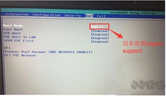 4、切换到Boot,把Boot Mode从UEFI改成Legacy Support;