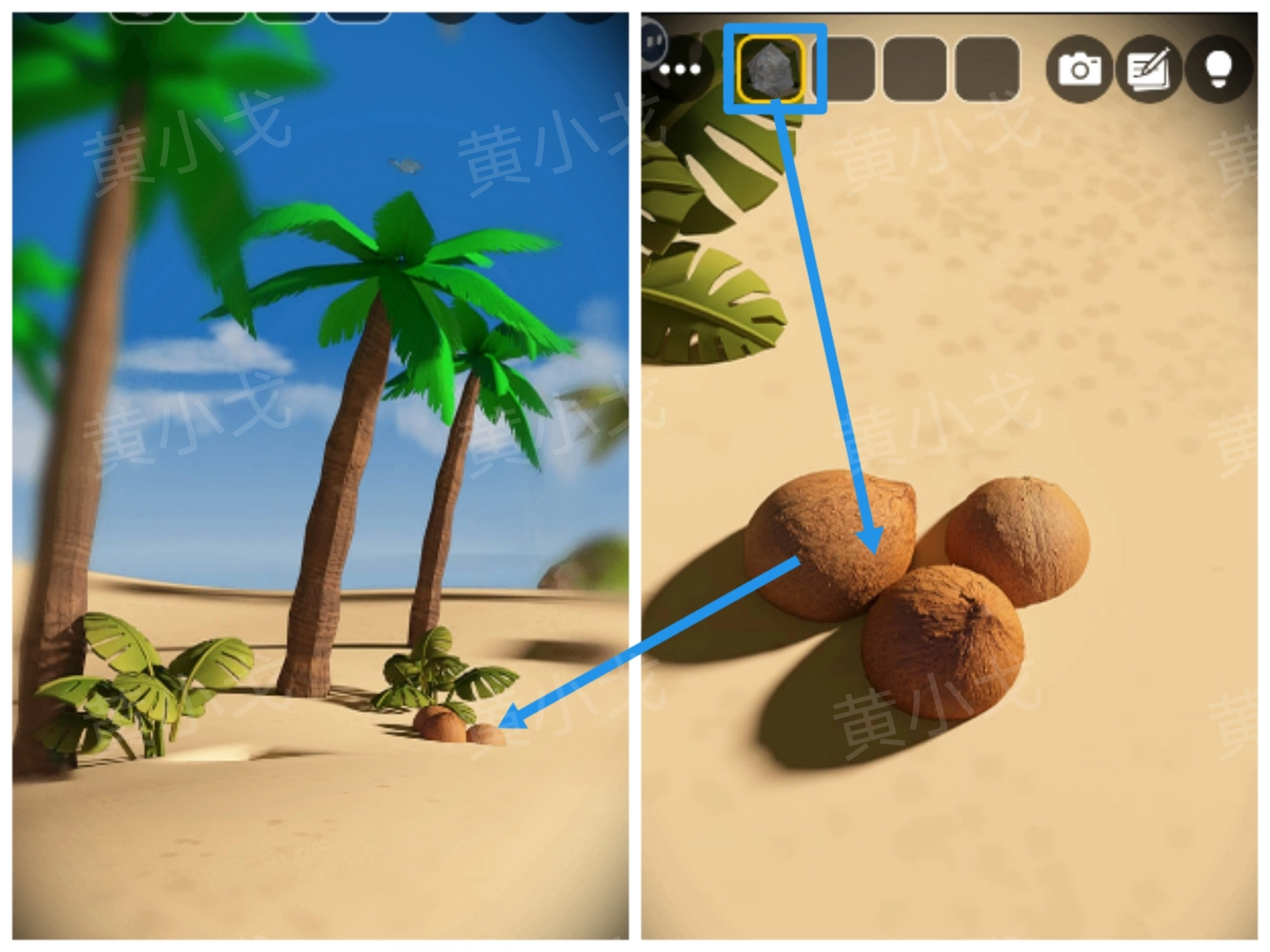 3.点击掉落的椰子,用【石头】砸开