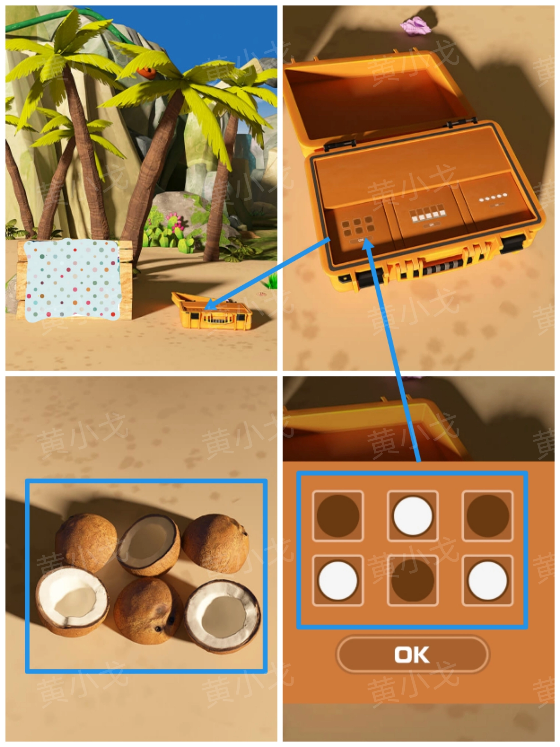 7. 轻点地上的行李箱,接着点击左侧夹层处的密码锁,按照[铁笼]场景里椰子颜色所提供的线索,对密码锁进行相应调整。