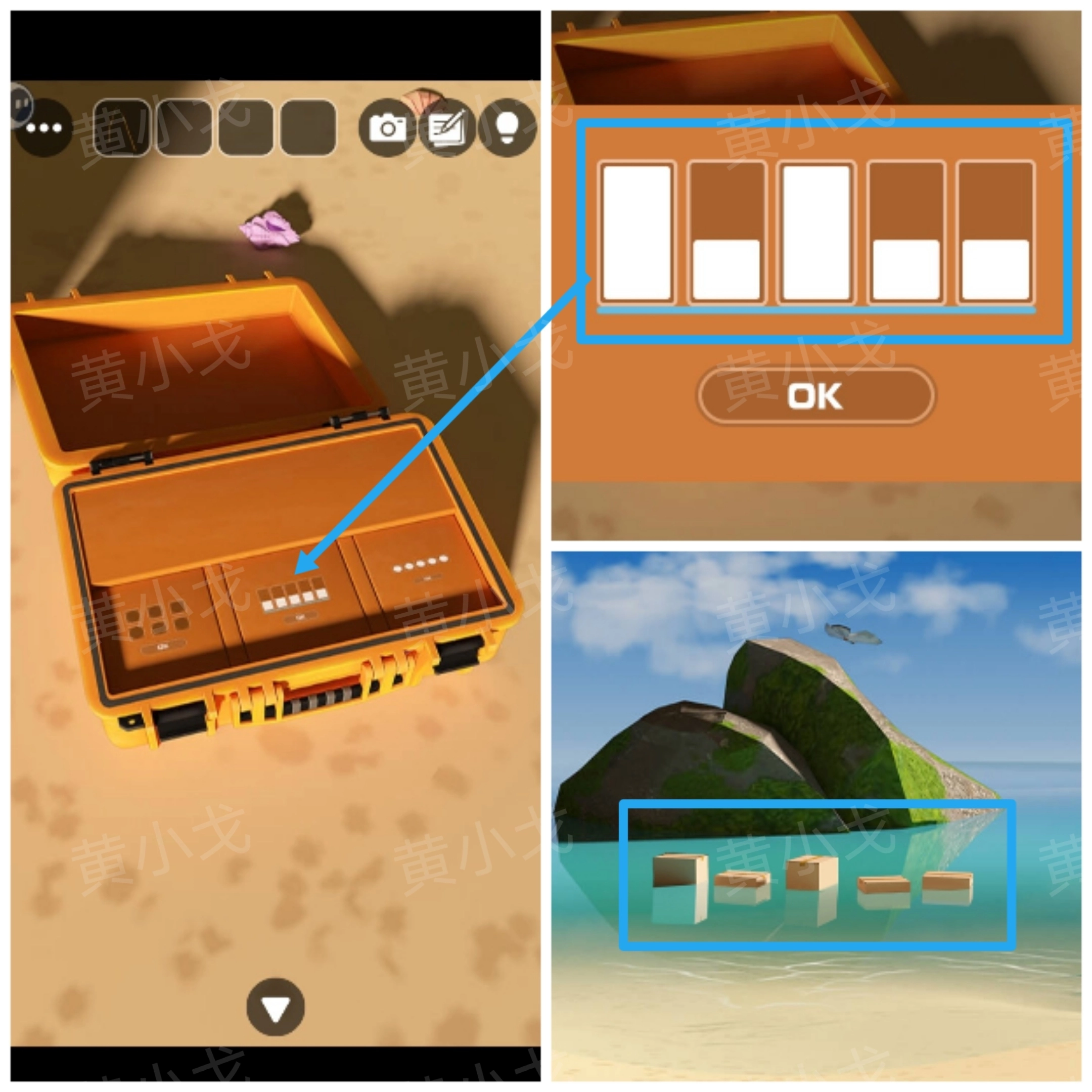 13. 轻点行李箱中间夹层处的密码锁,依据[收音机]场景里漂浮在海面上的纸箱高度所提供的线索,对密码锁进行相应调整。