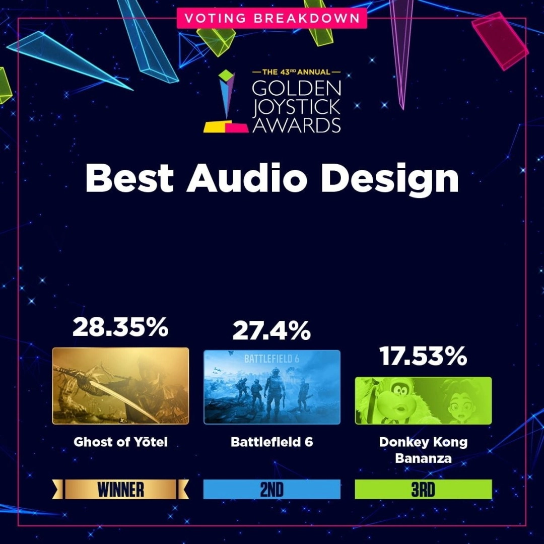 数据表明,部分获奖作品凭借绝对优势脱颖而出,而另有一些奖项的竞争则一直延续到最后时刻。其中最受关注的结果之一出现在“最受期待游戏”类别——《GTA6》和《巫师4》的得票率差距不足2%,各自为18.03%与16.68%。主办方表示,由于在某个环节两款游戏的票数曾迅速拉近,相关团队甚至已着手准备应对可能出现的反转局面。