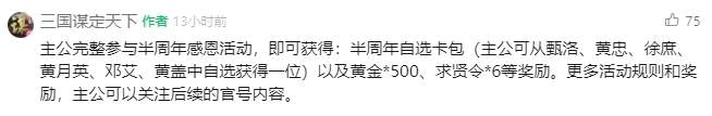 在此直接转发官方爆料——主公若完整参与半周年感恩活动,就能获取以下奖励:半周年自选卡包(主公可从甄洛、黄忠、徐庶、黄月英、邓艾、黄盖之中自行挑选一位获得),还有黄金*500、求贤令*6 。