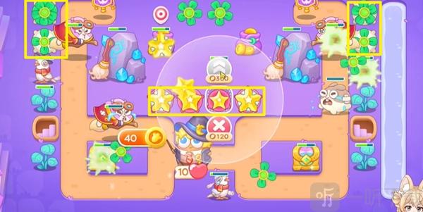 3、到了中期,我们借助四叶草与海星,将所有障碍物都拆除干净。接下来的任务,便是持续放置炮塔,以此补充火力。