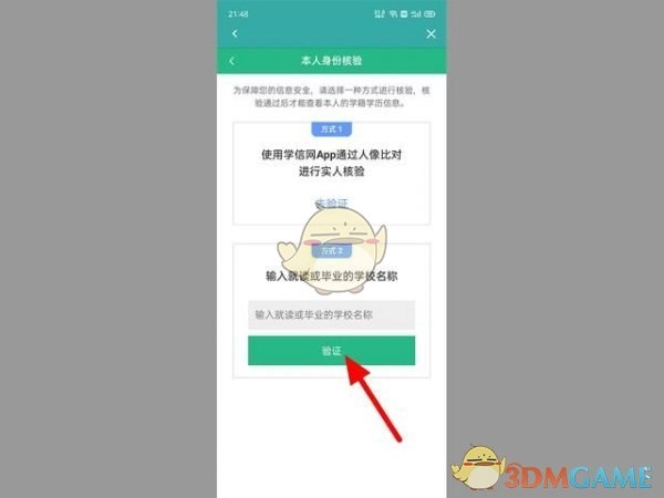 3、进入本人身份核验界面后,进行身份验证。以学校名称来说,在相应位置输入【校名】,然后点击【验证】按钮。