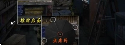 2、前往男厕,可以得到止疼药的线索,然后前往便利店,在里面棺材的后面得到黑伞,然后掰开固定帽得到止疼药。