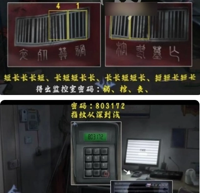 18、走进监控室,通过观察键盘上指纹的清晰程度,得出密码803172 。输入密码查看视频后,在抽屉中找到细铁丝,把细铁丝插入锁芯,完成小游戏便可离开。