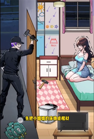 1、拖动后变为【床、电视机、泡脚桶、地板、红地毯、床头柜、衣柜、墙壁、窗户、吊灯】