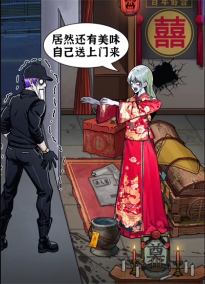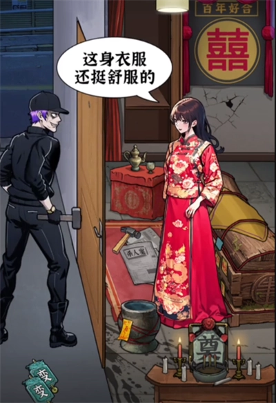 2、先打开柜子,取出【新娘衣服】帮她穿上。接着,用锤子敲击墙壁上的裂缝,之后再把【绣花鞋】给她穿上。