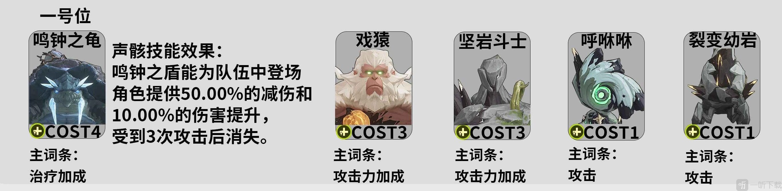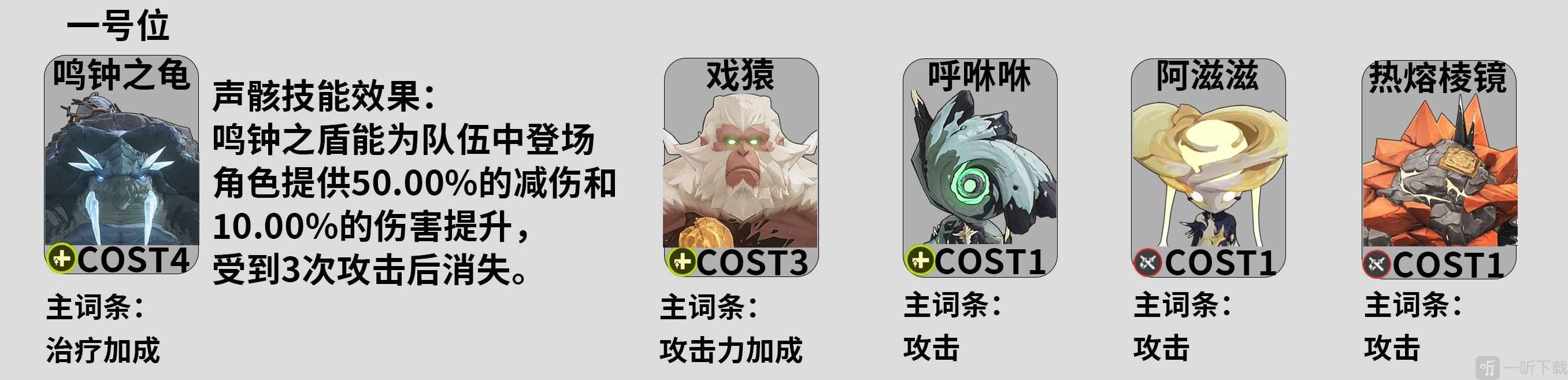 4在面对4级声骸时,可从三头鸟与钟鸣龟中择一,这里推荐选择钟鸣龟,因其具备减伤效果,对前期生存更为有利。